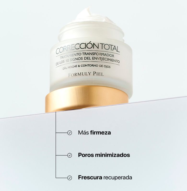 Corrección Total completa la rutina con una combinación de activos antiage, hidratantes y antioxidantes, que ayudan a mejorar la firmeza, la textura y la luminosidad de la piel, contribuyendo a una apariencia más uniforme y rejuvenecida.