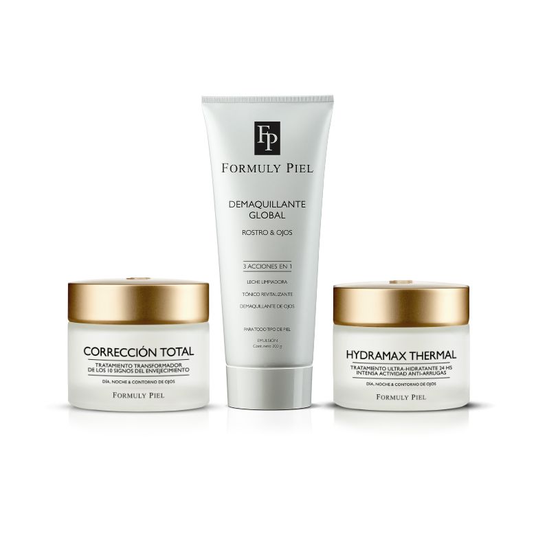 El combo incluye: 1 Emulsión Desmaquillante Formuly Piel Global 3 en 1 (200 ml), 1 Crema Antiage Formuly Piel Corrección Total Día/Noche (50 g) y 1 Crema Hidratante Formuly Piel Hydramax Thermal (50 g).