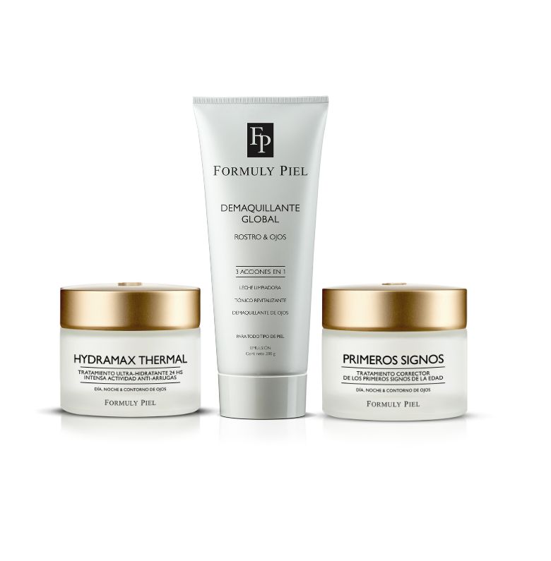 El combo incluye: 1 Emulsión Desmaquillante Formuly Piel Global 3 en 1 (200 ml), 1 Crema Antiage Formuly Piel Primeros Signos Día/Noche (50 g) y 1 Crema Hidratante Formuly Piel Hydramax Thermal (50 g).